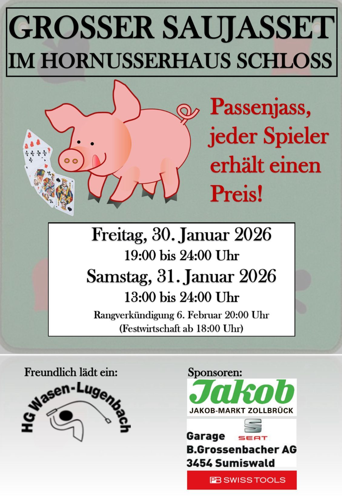 Auch in diesem Jahr findet im Hornusserhaus Schloss zwischen Sumiswald und Wasen wieder unser beliebter Saujasset statt. Es gibt wieder schöne Preise zu gewinnen.